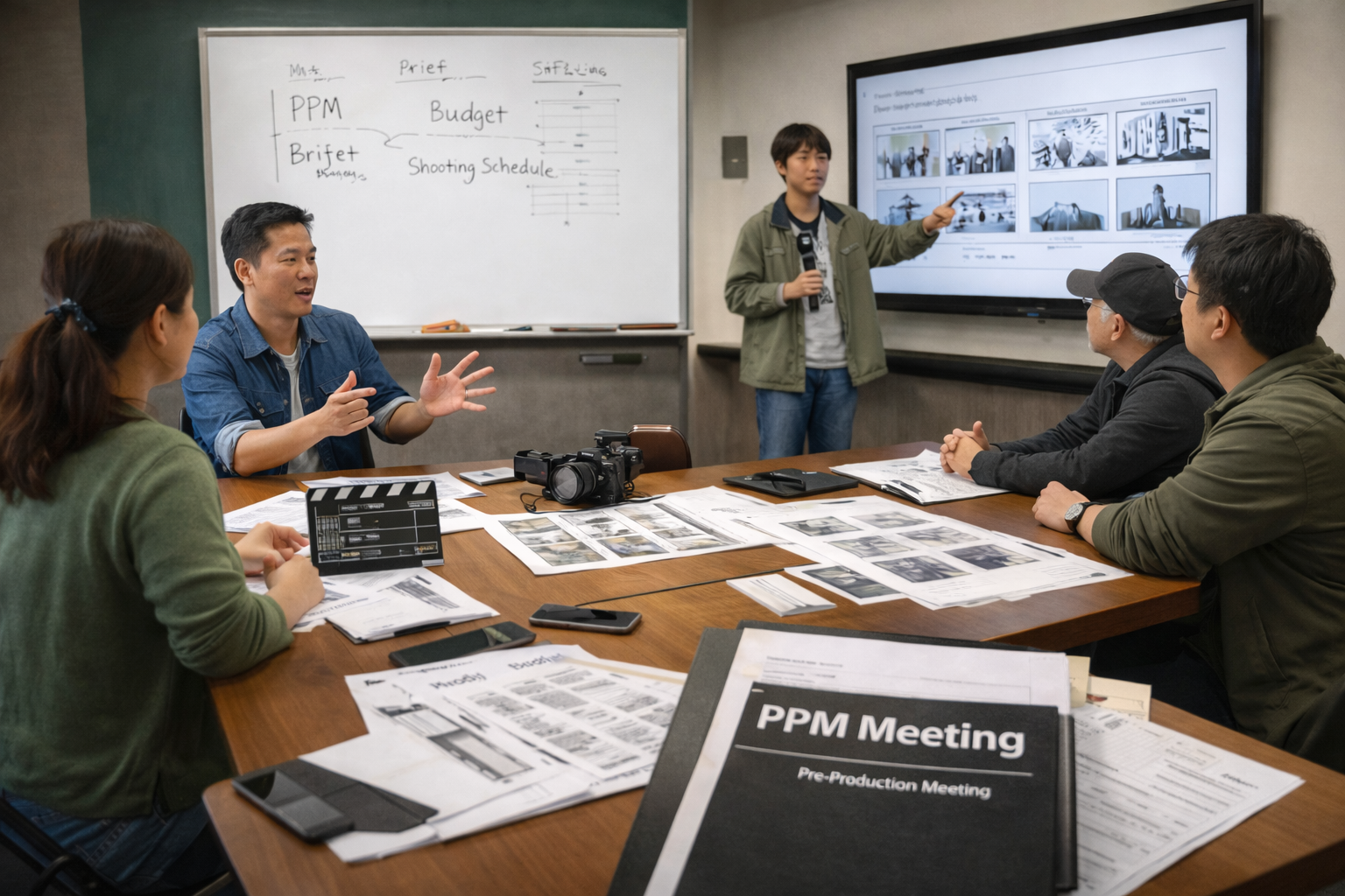 這些不是虛構的作業名稱,而是業界每天真正在跑的文件。課程的要求是:每一次 PPM 的決定都是不可逆的。學生在某一次 PPM 報告中確認了劇本、場景、服裝、預算與分工,後續的拍攝就必須基於這個版本往下執行,不能中途自己推翻、重來。這個設計,刻意讓學生體會「每一個確認,都是對客戶的承諾」。
