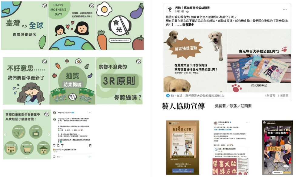 當學期共產出16個社會議題,包括流浪動物、導盲犬、性別議題、減塑環保、食浪費、心理健康、永續時尚、巿井攤販故事….等。執行內容為圖文貼文設計,粉絲互動,抽獎機制、任務挑戰、匿名投稿等方式,邀請大眾參與議題。其中如「盲走8秒挑戰」體驗視障者日常、以匿名故事平台傾聽女性心聲、用輕鬆互動推廣惜食行動,或記錄巷弄具歲月攤販的生命故事。從學生回饋中,感受本次課程學習不僅提升他們的專業能力,更多是多元素養的成長,包括跨領域整合、溝通協調、自主學習與同理能力。許多學生提到,這是第一次真正思考「如何把重要的事情說給別人聽」,也重新理解設計的社會角色。這次課程計畫推動在有限的時間與資源下,其社群影響力未必能立即擴大,但學生已清楚體會公益不是口號,而是需要被設計、被經營、被長期陪伴的行動。