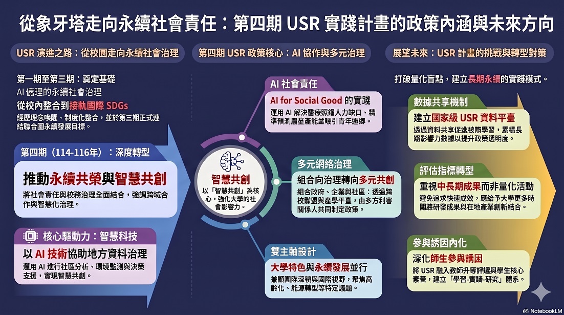 高等教育目前進入教育部第四期大學社會責任(USR IV)實踐階段。大學角色從單純的知識殿堂轉型為社會永續治理的行動者,特別是在 AI 科技與數位治理的輔助下,教學與社會需求的鏈結更為緊密。對於教師而言,USR IV 提供了創新的教學場域,透過帶領學生深入社區解決實務問題,不僅能強化學生的實作核心素養,更能提升其學習成效與解決複雜問題的能力。