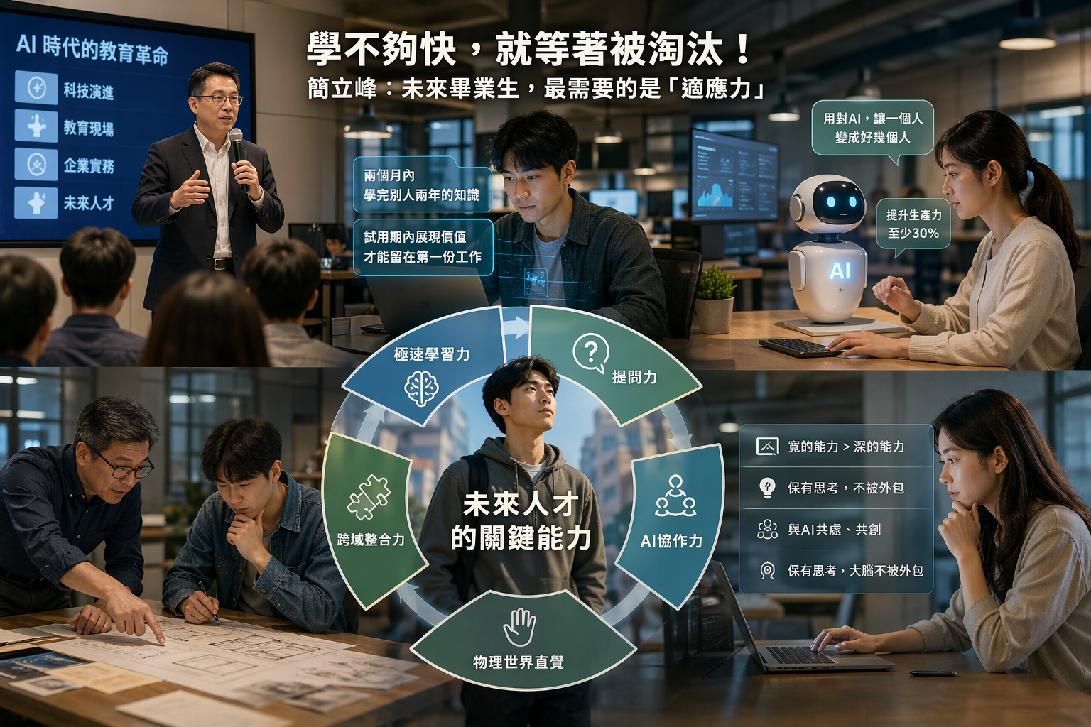 隨著生成式 AI 以前所未有的速度改寫產業規則,職場對新鮮人的「戰鬥力」定義已發生質變。當教科書知識在校園階段就被 AI 覆蓋,畢業生面臨的不再是緩慢的適應期,而是必須在極短時間內內化企業核心經驗的「極速學習」考驗。前 Google 台灣董事總經理簡立峰指出,未來人才的勝負關鍵,在於如何將 AI 作為生產力槓桿,同時保有不可被外包的「物理世界直覺」與「提問力」。